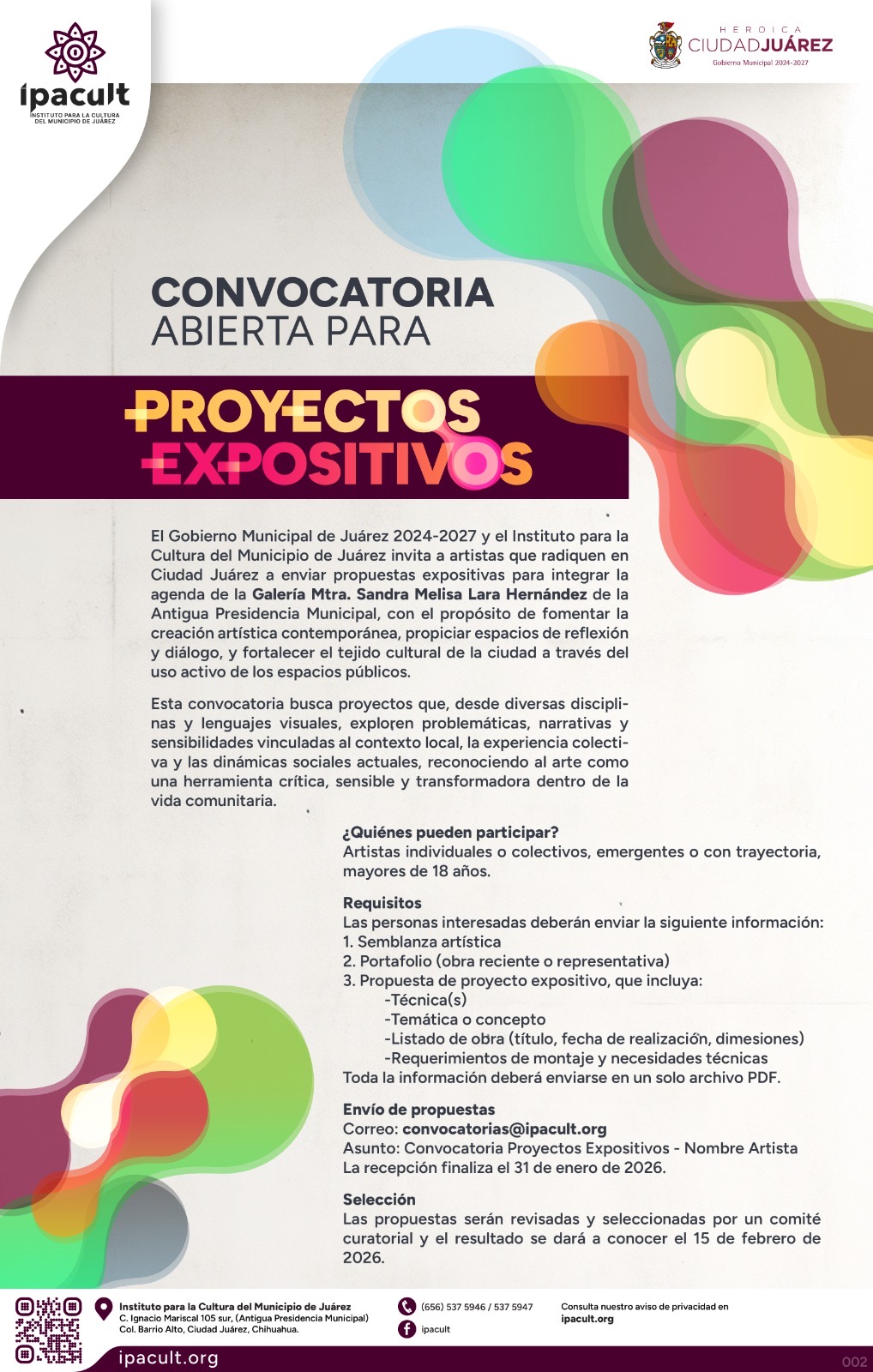 El Gobierno Municipal de Juárez 2024–2027, a través del Instituto para la Cultura del Municipio de Juárez (IPACULT), mantiene abierta la convocatoria dirigida a artistas residentes en Ciudad Juárez para presentar propuestas expositivas que formen parte de la programación de la Galería Mtra. Sandra Melisa Lara Hernández, ubicada en la Antigua Presidencia Municipal.