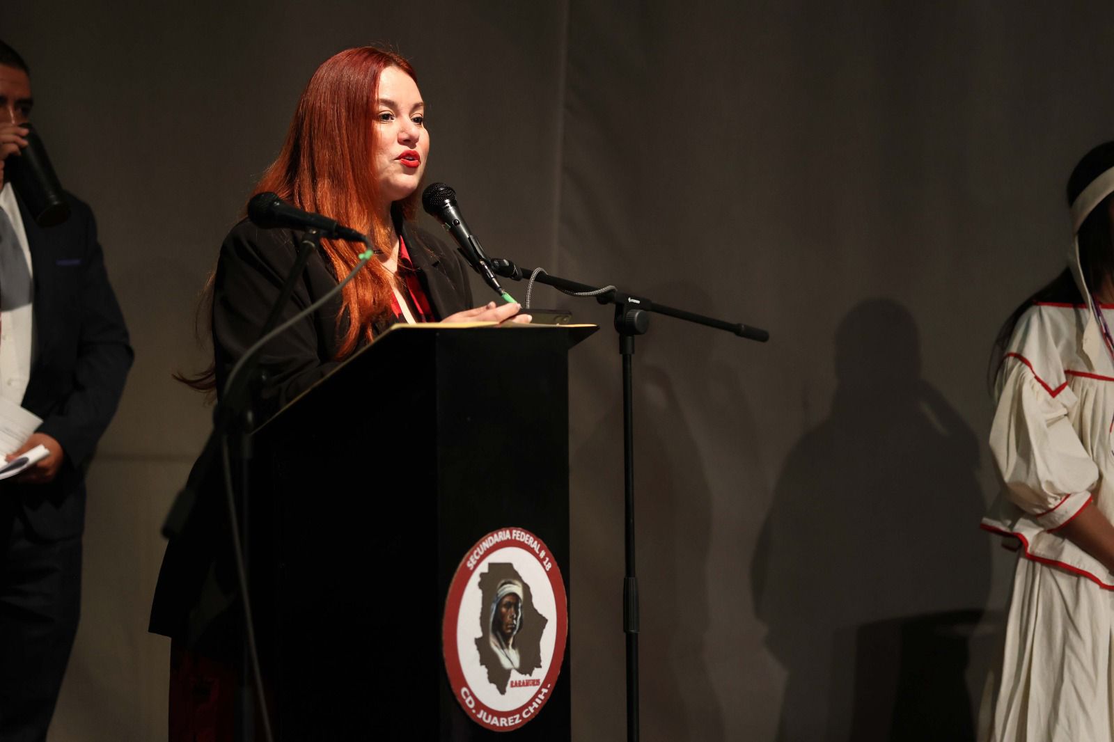 En representación del Presidente Municipal, Cruz Pérez Cuéllar, asistió Ogla Liset Olivas, encargada de la Dirección General del Instituto para la Cultura del Municipio de Juárez (IPACULT), quien reconoció el trabajo del sector educativo por generar espacios que fortalecen la identidad, el respeto a los símbolos patrios y la formación integral de niñas, niños y jóvenes.