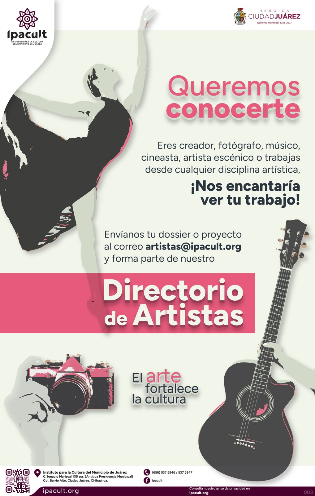 El Instituto para la Cultura del Municipio de Juárez (IPACULT) lanza una invitación abierta dirigida a todas y todos los creadores juarenses interesados en formar parte del Directorio de Artistas, una plataforma que busca visibilizar, conectar y fortalecer la comunidad creativa de la ciudad.