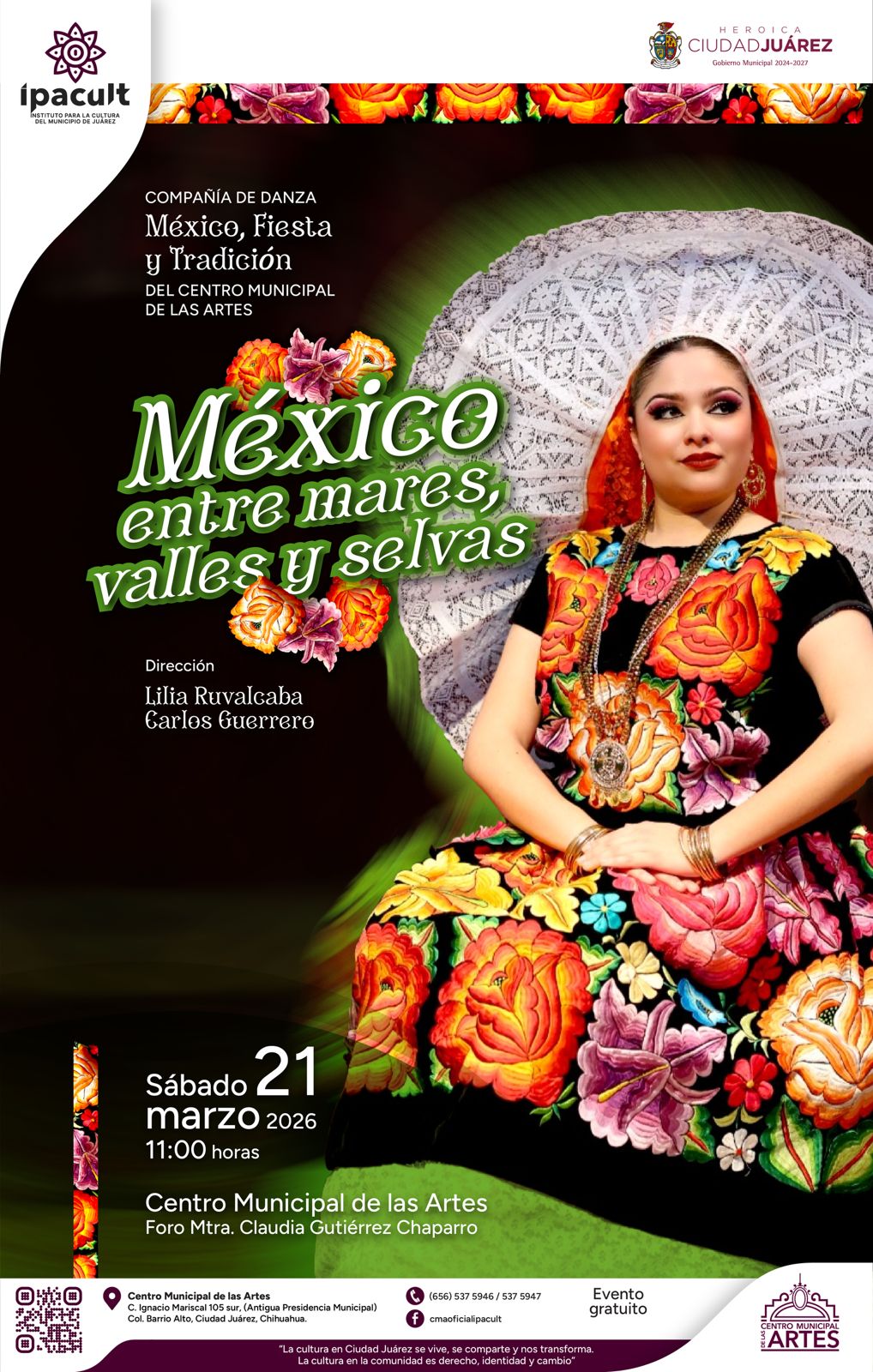 El Instituto para la Cultura del Municipio de Juárez (IPACULT) invita a la comunidad a disfrutar del espectáculo dancístico “México, entre mares, valles y selvas”, a cargo de la Compañía de Danza del Centro Municipal de las Artes (CMA), una propuesta escénica que celebra la riqueza cultural y la diversidad de las tradiciones mexicanas.